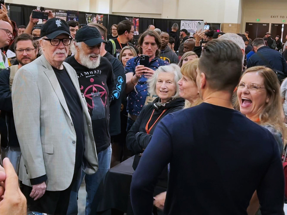 Au jeu des autographes et des séances photos, Danielle Harris s’est parée pour l’occasion de son costume de clown et d’une grande paire de ciseaux comme lors de la scène finale d’Halloween 4. Un clin d’œil de qualité auquel s’est également prêté plusieurs interprètes de Michael Myers en endossant la tenue du tueur, dont Tyler Mane, l’immense croquemitaine des deux films de Rob Zombie. Les fans ont pu profiter de ce moment de discussions avec les invités pour faire signer leurs objets (affiches, figurines, masques…) et échanger avec les nouveaux venus à l’exercice des conventions (les organisateurs ont réuni du beau monde, avec même les deux infirmières de la cellule de Michael Myers enfant dans la version longue du film original !). Parmi les invités exceptionnels de cette édition, on peut compter Steve Miner (réalisateur d’Halloween 20 ans après), Rick Rosenthal (réalisateur d’Halloween II et Resurrection), Rohan Campbell (le sombre Corey d’Halloween Ends) et Malcolm McDowell (le Dr Loomis du remake et sa suite). Mais un invité surprise n’a pas manqué de créer l’euphorie sur place : John Carpenter lui-même est venu participer à un panel sur le film original, durant lequel il a raconté de nombreuses anecdotes, entouré de ses acolytes Tommy Lee Wallace (réalisateur d’Halloween III) et Nick Castle (Michael Myers dans le film original et dans la dernière trilogie de David Gordon Green), ainsi que des acteurs PJ Soles (Lynda), Nancy Loomis (Annie), Sandy Johnson (Judith), Will Sandin (Myers enfant) et John Michael Graham (Bob), et s’est également exprimé sur la mise en scène de son nouveau film : Suburbian Screams, 13 ans après la réalisation de The Ward.