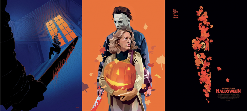 Réalisé via Compass International Pictures (possédant les droit du film original), d’où la mention « Moustapha Akkad presents » en début de recueil, Halloween Artbook présente 225 nouvelles affiches et artworks dédiés au film de John Carpenter. L’album de 250 pages, à reliure cartonnée solide du plus bel effet, est un must collector. 200 artistes du monde entier ont collaboré à cet ouvrage, qui dévoile à chaque page une vision époustouflante du métrage. Catégorisées en plusieurs chapitres (affiches, accents portés sur un personnage, une situation, la ville d’Haddonfield, etc…), les œuvres défilantes sont autant de plaisirs pour les yeux. Les inspirations sont variées et s’appuient sur une recherche visuelle éblouissante. Tous les genres sont représentés, du comics aux beaux-arts, en passant par l’illustration et l’animation graphique.