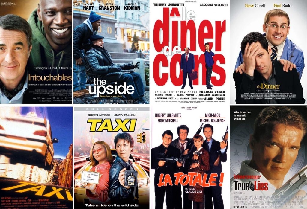 Si le géant américain est souvent de la partie en guise de remake, c’est malheureusement parce que la définition-même du cinéma actuel est indissociable de l’Oncle Sam (à tort ou à raison leader du marché audiovisuel, pour des raisons principalement financières). Non content de reproduire à outrance ses mêmes films sous le même schéma, il s’approprie aussi les succès nationaux de par le monde. À juste titre, puisqu’il ne s’agit pas d’un vol mais bel et bien d’un compromis. Pour un producteur de film, céder les droits de remake est souvent plus intéressant financièrement que d’attendre les recettes éventuelles d’une sortie à l’étranger, et principalement aux USA. Morse (Suède) se transforme en Let me in, Ringu (Japon) s’étiole en The Ring – Le Cercle, À l’intérieur (France) accouche d’un Inside, et [REC] (Espagne) devient En Quarantaine. Passent à la moulinette US des métrages aussi variés que Funny Games, The Grudge, Millenium, Les Infiltrés ou Speak no evil. À l’échelle de la France, c’est pourquoi Le Dîner de cons ou Intouchables sont devenus The Dinner et Sous un autre jour (The Upside) aux États-Unis. Exception faite de certains films purement sous l’enveloppe nationale restés intacts (Le fabuleux destin d’Amélie Poulain) tandis que d’autres ont parfois été totalement remaniés et perdant ainsi toute leur essence originelle (Taxi revu à la sauce américaine ou Bienvenue chez les ch’tis remaké en Italie sous Benvenuti Al Sud). Tout n’est pas à écarter puisque le remake le plus célèbre reste celui de La Totale ! devenu l’énormissime True Lies de James Cameron. Des productions françaises s’étant enlisées dans le sable mouvant putride du remake américain, on peut citer Un indien dans la ville devenu Un indien à New York (avec Tim Allen), Trois hommes et un couffin devenu Trois hommes et un bébé (avec Tom Selleck) et pêle-mêle Nikita, Banlieue 13, Neuf mois ou encore Mon père, ce héros et LOL. De sinistre mémoire, ajoutons aussi l’infâme Les Visiteurs en Amérique, tourné par le même casting français (acteurs et réalisateur) mais en remaniant noms des personnages et intrigues additionnelles, abandonnant au passage le respect du public français et toute trace de pouvoir comique. Pour anecdote, c’est le film Perfetti sconosciuti, une comédie italienne de 2016, qui met en scène un dîner qui dégénère quand les convives commencent à regarder dans le téléphone de leur voisin, qui détient ainsi le record au Guiness Book du nombre de remakes, avec 19 versions réalisées en trois ans. Il a notamment été adapté en France (aka Le jeu en 2018), au Mexique, en Corée du Sud, en Russie, en Allemagne et en Pologne. (source : radiofrance)