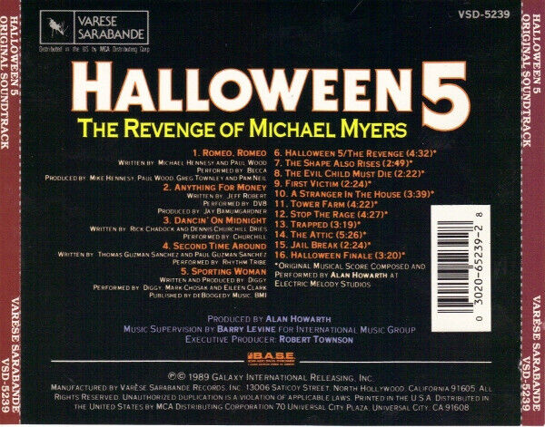 Premier film de la saga à avoir qualitativement souffert d’une production et mise en chantier hâtives, Halloween 5 a emporté dans son empressement la composition de sa bande originale, toujours signée par Alan Howarth, et reprenant parfois trait pour trait les morceaux issus du film précédent.