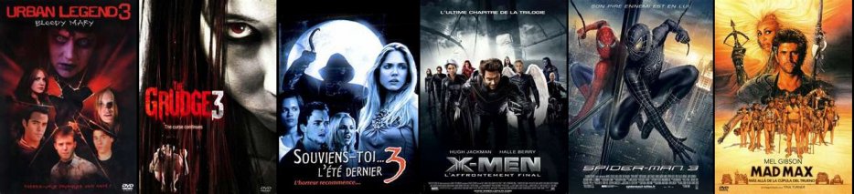 Piégé par la notion de trilogie énoncée par Scream, le cinéma d’horreur (et surtout le néo-slasher) a dû suivre le mouvement, opérant à tous les films ayant eu une suite un troisième torchon qui enfonce le clou au point souvent d’en faire surgir toute la nullité, et l’inutilité (Candyman 3: le jour des morts, Souviens-toi l’été dernier 3, Urban Legend 3, Creepshow III, et par extension Lake Placid 3, Anaconda 3 : l’héritier, Une Nuit en Enfer 3 : la fille du bourreau). Mais tous les registres se montrent concernés, qui plus est quand ils ont été déclinés en DTV (Starship Troopers 3 : Marauder, The Grudge 3, Boogeyman 3, Wishmaster 3). La trilogie se veut parfois tellement mécanique qu’elle repose complètement sur la notion de film final pour accentuer l’intérêt auprès du public (X-Men : l’affrontement final [par ailleurs renforcé à l’époque par le slogan le plus inutile de l’histoire du cinéma : L’ultime chapitre de la trilogie], Blade Trinity). Scary Movie 3 rira même de ce procédé en y flanquant le slogan Les meilleures trilogies sont en 3 épisodes.