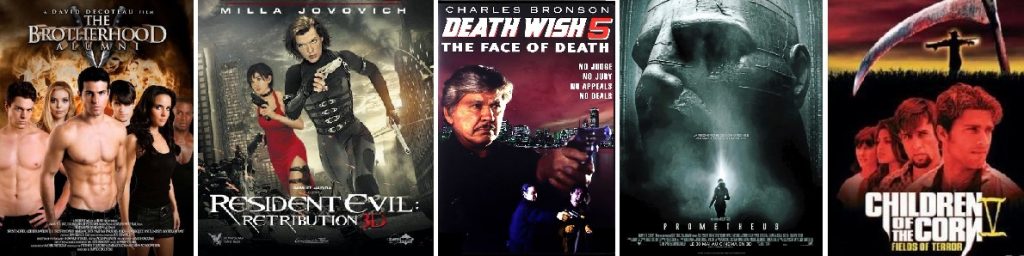D’autres séries de films ont l’air de ne jamais s’être demandées quand est-ce qu’elles s’arrêteraient (ni même si elles s’arrêteraient un jour) et étalent encore davantage sur la tartine le peu de confiture qui leur reste : Resident Evil : Retribution, malgré l’arsenal d’idées issu du jeu vidéo d’origine, suit sa propre quête peu inspirée et peu ragoûtante. Une saga aux moyens colossaux qui n’a pas l’air de s’essouffler à la vue des revenus engendrés au box-office. Dans un tout autre registre, et à des années lumière des budgets hollywoodiens, la saga Brotherhood étoffe son casting de jeunes éphèbes testostéronés avec Alumni, avec lequel le réalisateur David Decoteau poursuit sa quête (sans doute désespérée) d’un scénario de plus de trois pages. Même Charles Bronson racle le parquet dans l’immonde Death Wish : the face of death, cinquième épisode d’Un justicier dans la ville ! Et qui aurait pu croire que Fast & Furious allait pouvoir s’étendre jusqu’à un Fast Five hyper-protéiné ? Comment la saga a-t-elle pu s’étirer jusque-là (et on est encore qu’à mi-parcours de ce qu’elle décimera au final) ? Un mystère auquel pourrait aussi tenter de répondre les increvables et minables séries des Beethoven, Police Academy et American Pie dont les ersatz polluent sans raison valable la télévision et le cinéma.