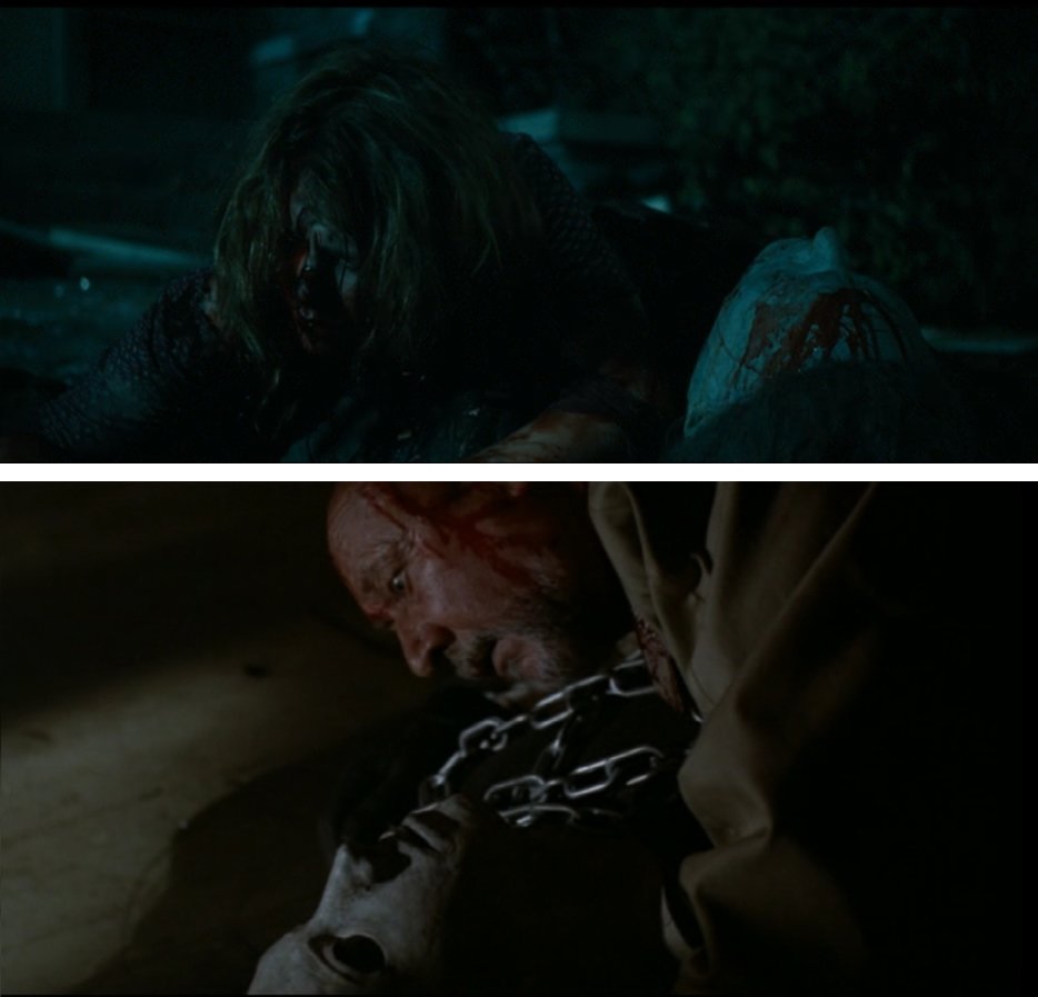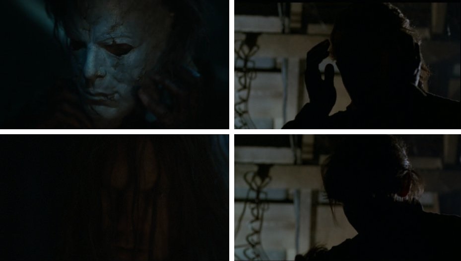 Dans les dernières minutes d’Halloween remake, Laurie se réveille nez-à-nez avec son bourreau, après que ce dernier lui ait foncé dessus et qu‘ils aient tout deux chuté de l’étage de la maison. Dans Halloween 5, à la fin du film également, c’est le Dr Loomis, qui lui s’effondre d’épuisement sur le croquemitaine inanimé. Deux séquences très proches dans leur trame autant que dans leur mise en scène, qui valent vraiment qu’on soulève l’idée qu’en 2007, Rob Zombie se soit inspiré de près ou de loin à de nombreuses idées envisagées ou développées dans le métrage de Dominique Othenin-Girard en 1989. Aujourd’hui encore, le doute subsiste...