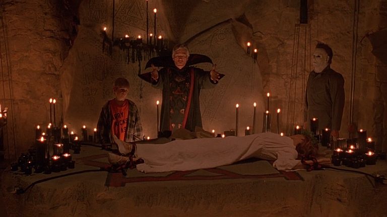 Pour répondre à la question « Qui est le père de l’enfant de Jamie ? », il faut revenir un peu en arrière. Halloween 5, en 1989, présente un nouvel aspect de Michael Myers, jusque-là insoupçonné : une certaine forme d’humanité face à sa nièce Jamie, et un symbole païen (source du mal qui le dévore) gravé sur le poignet. De plus, les apparitions d’un homme vêtu de noir tout au long du métrage parsème le mystère. Malheureusement, Halloween 5 n’ira jamais au bout de ses nouvelles bases. Il ne fera que placer ça et là des éléments emplis d’interrogations. Le réalisateur et scénariste Dominique Othenin-Girard a même gardé le secret de qui était cet homme en noir, obligeant le scénariste du prochain film a lui trouver une identité. Daniel Farrands, fan d’Halloween et scénariste de Halloween 6, tente alors de combler les brèches et fait réintervenir des personnages secondaires du premier film de la saga, notamment Terence Wynn, collègue de Loomis à Smith’s Grove, et maître de la secte Thorn à l’origine de la barbarie de Michael Myers.