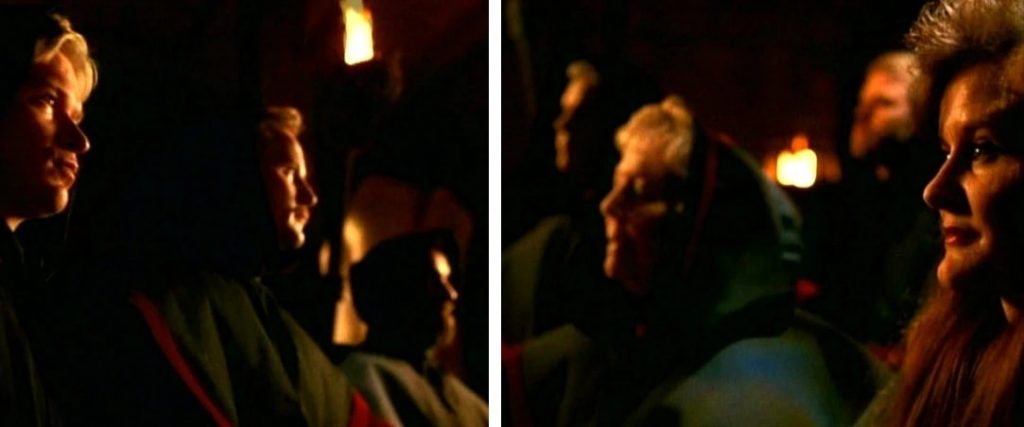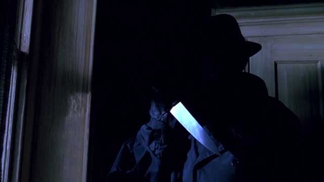 Cette scène expose la tenue de l’homme en noir, de l’imperméable au chapeau, suspendu au porte-manteau d’un couloir de la maison. Se pourrait-il qu’un membre de la famille Strode soit un adepte de la secte de Thorn ? Les adorateurs de l’alliance païenne à l’origine de la barbarie meurtrière de Michael Myers auraient-il réussi à intégrer la famille de Laurie ? Ce doute, non levé dans le film (quelle que soit sa version), c’est à nouveau le scénariste Daniel Farrands qui l’explique lors d’un échange exclusif pour ZeShapeHalloween. Les raisons de la présence de ce costume dans le film sont finalement beaucoup moins littérales : « C’était dans le script, mais par une autre scène qui a été écartée et donc non incluse au métrage final. Au début du film, Danny a sa vision de cauchemar et voit l’homme en noir dans sa chambre. Dans le scénario, il s’enfuit de sa chambre et s’aventure dans le couloir, pour retomber nez-à-nez avec l’homme en noir [à la manière d’Halloween 4 avec le rêve de Jamie Lloyd, NDR]. La famille Strode vient à son secours, allume la lumière et découvre qu’il ne s’agissait que de cette veste et chapeau noirs suspendus au mur. J’adore le fait que les fans, les vrais, aient remarqué que ce costume est resté dans le film, alors qu’il ne devait servir que pour cette scène inédite. Ça n’était pas un accident. Mais personne ne sait que cette séquence devait à l’origine servir à quelque chose de différent » .