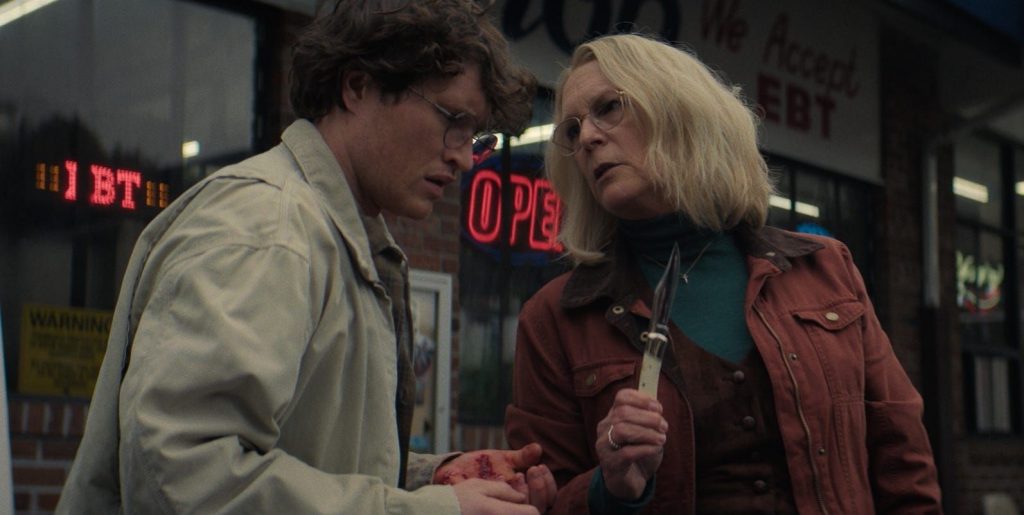 Laurie Strode, quant à elle, tente de renouer avec un semblant de vie. Installée dans une nouvelle demeure en plein cœur de Haddonfield, elle subit elle aussi les foudres des habitants qui l’accusent d’avoir mené la ville à être le tombeau qu’elle continue d’être, même quatre ans après le dernier massacre de Michael Myers. On aura du mal à comprendre comment le personnage toujours incarné par Jamie Lee Curtis peut à ce point considérer l’idée (l’utopie ?) de vivre une vie normale à Haddonfield après la mort de sa fille et la disparition de Myers, alors que pendant les quarante dernières années elle vivait recluse et excentrée à appréhender le retour d’un tueur pourtant bien en prison. Mais qu’importe, car avec moins de 120 minutes pour étaler son épilogue, Halloween Ends ne sera pas à un raccourci près. Avec ce film, David Gordon Green tient à la fois à apporter un souffle neuf sur une saga déjà bien chargée (on en est quand même au treizième opus), mais aussi à lorgner avec un genre nouveau, voire plusieurs, allant du drame romantique (et son lot de mièvreries) au film noir (reflet d’une Amérique en souffrance). Le tout bien entendu rythmé par quelques jump scares inévitables et des meurtres lorgnant entre le déjà vu (l’épinglage au mur, vu dans les épisodes 1, 4, 6, 8, 9 et 11 de la saga), le gore grand-guignolesque (la langue sur le tourne-disque) ou le hors-champ aberrant (la mère de Corey, la petite frappe et son gang). L’ensemble, bien que toujours emprunt à un pessimisme à peine dissimulé, change complètement de tonalité avec des choix scénaristiques audacieux, bien que souvent décriés. Et pour cause…