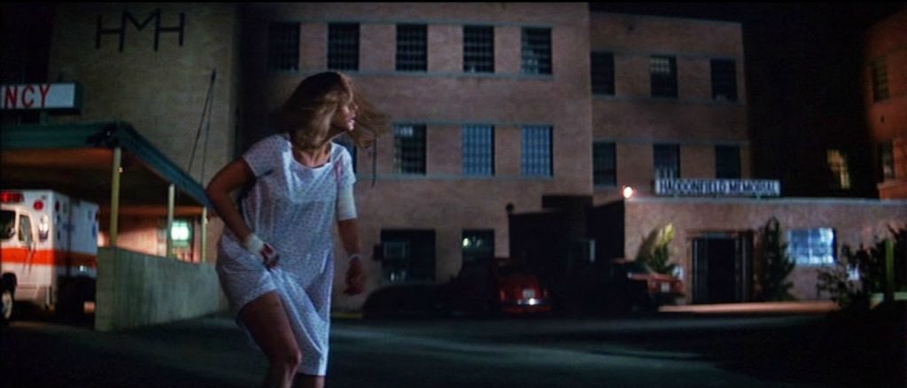 Laurie, quant à elle, arrive à la clinique de Haddonfield, tétanisée à l’idée d’être endormie le temps de son hospitalisation (cette réaction fait écho à la peur du croquemitaine, démon qui hante les enfants la nuit). Jimmy, jeune ambulancier, tente de prendre Laurie sous son aile, en dépit d’une ambiance à couteaux tirés au sein du personnel de la clinique. Pendant ce temps, une rapide autopsie permet à un médecin de constater que la dentition du cadavre brûlé appartient à un jeune homme de 17 ou 18 ans. Loomis, précisant que Michael Myers est âgé de 21 ans, sous-entend que les recherches de la police doivent reprendre : Myers est toujours vivant. Ce dernier est d’ailleurs déjà en route pour la clinique après avoir entendu à la radio que la jeune survivante du massacre, Laurie Strode, venait d’y être conduite. Halloween II soulève dès lors plusieurs points importants dans la construction du mythe de Michael Myers. Tout d’abord l’invulnérabilité du tueur, approchée dans le premier film, confirmée ici grâce aux plans d’un Myers à la respiration toujours aussi nette. De plus, Myers poursuit dorénavant un but : retrouver Laurie Strode, tandis que dans le premier film il n’hésitait pas à mettre cette quête de côté, le temps d’aller ‘rendre visite’ aux amies de la jeune fille. Le spectateur peut se préparer à trembler, conscient de la force incommensurable du tueur, prenant parallèlement de l’avance sur la pauvre Laurie qui, persuadée que le tueur est mort, est loin d’imaginer les événements qu’elle va encore devoir affronter.