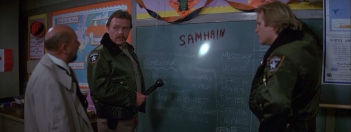Ensuite, le couvert de culte païen avec l’entrée en scène du mythe de Samhain, évoqué par le Dr Loomis dans la salle de classe de Haddonfield dans le film. Cette inscription « écrite » dans le sang par Myers lui-même relierait ses méfaits à un rite mystique associé à la religion gaélique moderne sensée symboliser le passage à la période sombre de l’année (forme ancestrale de la fête d’Halloween). Cette part de magie, certes intéressante pour certains, reste une évocation vague et gratuite, quelque peu déséquilibrée, qui entrave à son tour le scénario original pour surfer sur la vague maléfique à l’origine du 31 octobre. Halloween III : le sang du sorcier, bien que développant une toute nouvelle trame, poursuivra cet aspect obscur d’Halloween avec les ressorts de sorcellerie antique et moderne et du pur surnaturel. Halloween 5 et Halloween 6 plongeront quant à eux tête la première dans les méandres de cette conspiration malfaisante à grands renforts de rites, de magie, de tatouages et de malédiction séculaire, au détriment de la simplicité originelle si efficace du Mal à l’état pur lâché dans les rues d’une petite bourgade américaine traditionnelle.