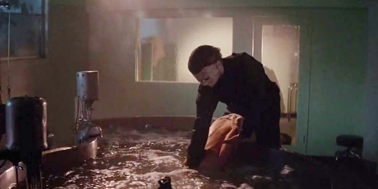 L’une des morts les plus emblématiques et malsaines de la saga apparaît dans Halloween II (1981), celle du bain thérapeutique (the hot tub). Le film de Rick Rosenthal, animé par l’essor qu’avait déjà pris le slasher au début des années 80, obligeait Michael Myers à se montrer original et démonstratif dans ses meurtres pour rester dans la course. Si Halloween brillait par la subjectivité des mises à mort (peu de sang, réalisation aux accents sous-jacents), Halloween II est plus probant, plus incisif (coups de marteau, seringue, scalpel et effusions sanglantes). Entre deux recours à l’arme blanche, Michael Myers exécute un double meurtre atypique dans les recoins sombres et glaçants de la clinique de Haddonfield.