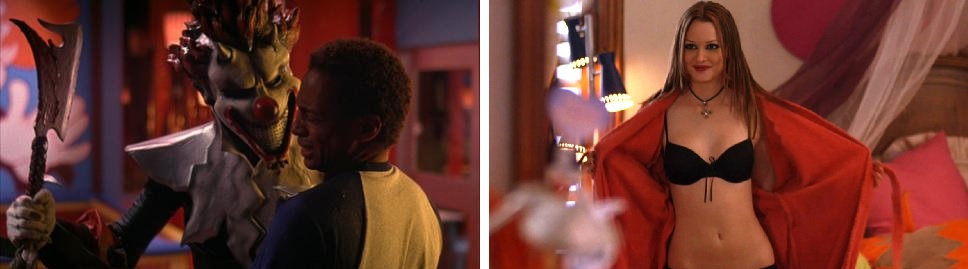 Toutefois, ce torchon permet aussi de faire un bilan sur les clichés que le slasher véhicule à travers les années, retravaillés ici pour les circonstances. L’héroïne vierge est ici adepte de black metal et impatiente de fêter son 18e anniversaire pour s’envoyer en l’air avec son petit copain (Nicholas d’Agosto, devenu depuis le héros de Destination finale 5), le tueur habillé en immense clown démoniaque qui apparaît et disparaît comme bon lui semble en crachant des répliques salaces dignes de Freddy Krueger (« Laisse-moi glisser mon hot dog dans ton pain chaud !« ). Le tout sans omettre le langage fleuri digne d’un film de Rob Zombie, les flics benêts et inefficaces (dont Lola Glaudini, vue depuis dans la série Esprits Criminels), le ouija, les dénonciations politiques, les situations tirées par les cheveux, les réactions absurdes et son lot de niaiseries adolescentes (relevons au casting les deux rejetons de la série Gossip Girl Leighton Meester et Penn Badgley, futur tueur en série dans la série You). L’ultime recours des slashers non inspirés, c’est de piocher délibérément dans ses illustres prédécesseurs : la génération des parents maudits (Les griffes de la nuit) après un meurtre façon Le jour des fous, la réplique éculée « On garde le secret jusqu’à la tombe » (Souviens-toi l’été dernier), le final pompé sur Happy birthday to me, l’héroïne qui s’appelle Carpenter, le film cite aussi L’Exorciste, plagie Shining et présente le meurtre au micro-ondes un peu à la manière du tueur de Saw. L’humour est également à côté de la plaque, et les allusions tirées du fantastique empêchent définitivement de s’identifier aux personnages. Restent donc quelques séquences visuellement efficaces (le corps tranché, façon Destination finale 2), ce qui ne fera malheureusement pas de Burger Kill un film recommandable.