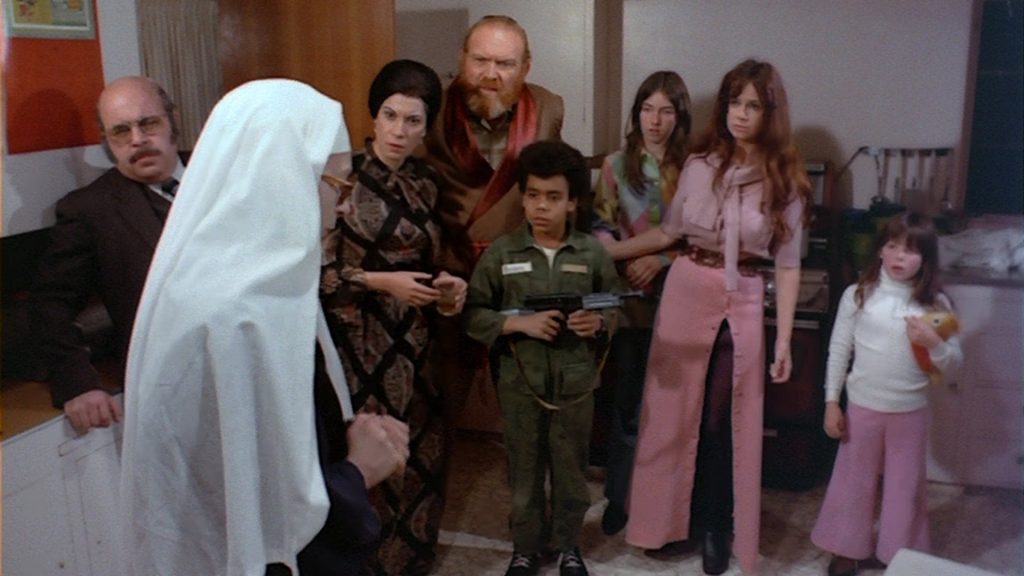 L’envers du décor n’est pas des plus évident non plus, puisque Cinq fois la mort n’a pas un mais deux réalisateurs. Le premier, Sean MacGregor, qui est le seul désigné au générique d’ouverture, a été viré après quelques difficiles semaines de tournage car ses rushs étaient considérés comme inutilisables. Il a même été dit que son côté instable l’a conduit à passer lui-même beaucoup de temps en instituts psychiatriques, bien que cet élément n’a jamais été confirmé. Le film est au final le mélange de ses prises de vue et de celles que le second réalisateur, David Sheldon (scénariste de Grizzly I & II et producteur de Survivance), a mis en bobine plusieurs semaines plus tard. Toujours dans un registre glauque, la jeune actrice Gail Smale (Sœur Hannah) était à l’époque du tournage la petite amie mineure de Sean MacGregor. Son accoutrement de « nonne » voilée de rouge avec ses lunettes roses étaient surtout un moyen de dissimuler les marques de son albinisme. Elle n’a d’ailleurs jamais joué dans un autre film que celui-ci. Enfin, l’actrice Carolyn Stellar, qui joue le rôle de Lovely, noyée dans la baignoire, est la mère de deux des enfants du film (Leif Garrett et Dawn Lyn). Ceux-là même traîneront le corps inanimé de la femme dans la neige, un souvenir plus perturbant pour le jeune acteur Tierre Turner que pour les deux bambins à la vue de leur mère nue et prétendue morte. L’ampleur dérangeante du film dépasse donc largement son résultat final, choisissant d’ailleurs de ne pas clore l’opus de manière traditionnelle, puisqu’il se termine par le mot « The beginning » au lieu de « The end ». Sommet du cringe. D’une certaine manière, on est en présence d’un The Strangers avant l’heure… mais, reconnaissons-le toute de même, en beaucoup moins bien.