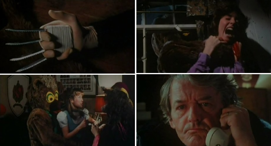 Un mythe tente de se mettre en place au sujet de Dickie Cavanaugh, un homme accusé d’avoir assassiné sa petite amie et qui s’est donné la mort dans un asile. Tandis que la sœur de Cavanaugh tente d’étouffer le drame en gageant deux hommes d’enterrer le corps, quelqu’un surgit et tue les deux fossoyeurs à coups de pelle. Encore non au courant de ce massacre, les jeunes font de Dickie Cavanaugh le sujet de toutes les conversations lors d’une soirée de fête sur le campus. Alors que les rapports entre les uns et les autres viennent à s’envenimer, un des protagonistes est frappé à mort au poignard, et la combinaison de la mascotte de l’équipe dérobée par le meurtrier. L’hécatombe ne fera que commencer. Un à un, les jeunes trépassent sous les assauts du nounours revanchard. Sifflant des insanités lors de ses meurtres, le tueur se veut comme une habile combinaison entre les mystérieux assassins gantés des giallo (qui soufflent des tirades menaçantes au téléphone) et les emblématiques monstres contemporains sévissant dans les couloirs sombres d’un lycée. Encore une fois, l’idée aurait pu fonctionner, sans ce costume ridicule. Ceux qui s’attendaient à un savoureux pastiche parodique du genre seront déçus : tout est traité avec un regrettable sérieux. Un plan précurseur malgré tout : l’attirail que se crée le tueur, semblable à la main griffue qu’arborera le futur Freddy Krueger dans Les griffes de la nuit, et qui servira à un meurtre simple mais bien salace.