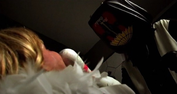 Mais là ou le bât blesse, c’est que Gutterballs a tout de même quelques points forts. Quoique, les termes sont quelque peu exagérés. Disons qu’il y a quelques hommages au 7e art de genre, peut-être pour enfoncer encore plus le clou (la quille ?) de la médiocrité par rapport à des modèles tels que Les griffes de la nuit (pour le générique du début et la confection des quilles et du masque), de Maniac (les producteurs ont accepté un pastiche de l’affiche du film de William Lustig pour la promotion de Gutterballs*), une référence verbale à 976-Evil et une allusion à La nuit des masques avec la scène de la fille confondant le tueur avec son petit copain déguisé puis qui se fait étrangler, cette fois avec des lacets de chaussure à défaut du fil du téléphone. Ensuite, quelques effets gores bricolés à l’ancienne pourront ravir les fans de série Z, avec une quille collée au fond de la gorge d’un transsexuel, autre quille taillée en pointe enfoncée dans l’œil, gorge tranchée au couteau, tête explosée entre deux coups de quilles, un visage décimé dans un appareil à lustrer les boules de bowling, et LA trouvaille qui a rendu le film culte chez certains dérangés du ciboulot : le 69 meurtrier, ou comment un gars et une nana s’étouffent mutuellement avec leur partie intime. Hallucinant.