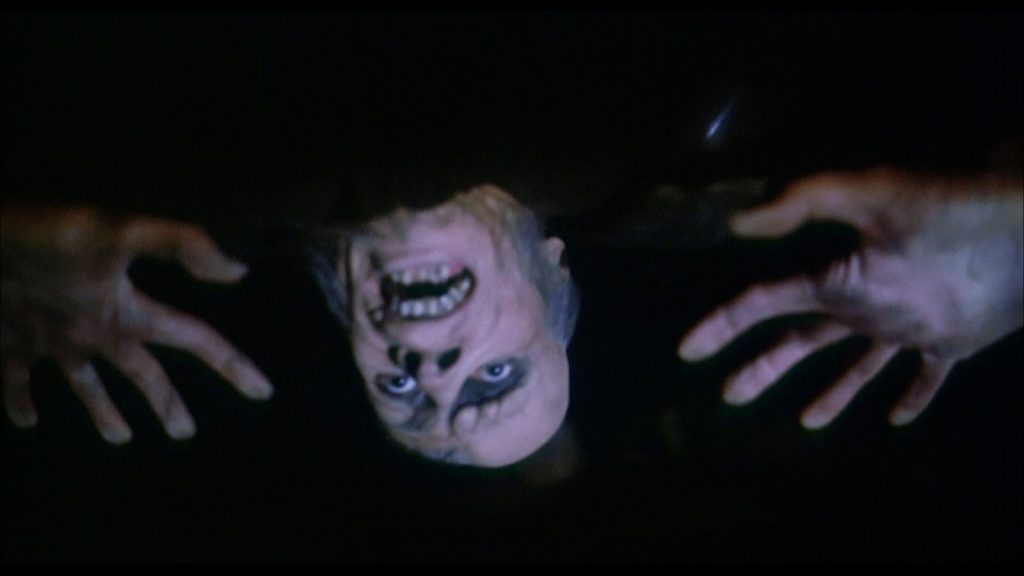 C’est donc à un slasher assez ordinaire dans son traitement qui défile sous nos yeux, choisissant de garder à l’œil les atouts de l’époque, soit la beauté des acteurs, et le décolleté plongeant de Linda Blair, résolue à un rôle de potiche héroïque cherchant par tous les moyens à s’extraire des griffes de la saga l’ayant rendue célèbre (L’Exorciste II est encore malheureusement dans toutes les mémoires), quitte à affronter ici de nouvelles formes de monstres. Aussi objectifs que l’on puisse être face au résultat final, force est de reconnaître que ce film ne vaut que pour son semblant d’ambiance et pour sa tête d’affiche. Le métrage a été décoré d’un succès très moyen lors sa sortie limitée dans les salles de cinéma, et est surtout la dernière production de Compass International Pictures (Halloween) avant un bouleversement important dans ses représentants. Étalant plus que dénonçant les frasques des différences sociales via des personnages variés mais tous d’un ennui abyssal, Hell Night cherche surtout étrangement à véhiculer un message d’espoir auprès des persécutés, voyez par là les classes moyennes, alors qu’il fait de son duo d’opprimés physiques les monstres diminués et barbares du film. Bien que ces monstres sont le fruit d’une forme de rejet de la figure paternelle, le contexte reste largement discutable. À cela, voir la seule nana intelligente du groupe être l’unique survivante du métrage tend à inscrire au fer de lance qu’il n’y a de place que pour les êtres pourvus d’une certaine forme de clairvoyance et d’un minimum d’ingéniosité et de bravoure. Car si le film est assez médiocre, son dernier quart d’heure insuffle toutefois une touche d’énergie qui rend l’affrontement final plutôt satisfaisant, et visuellement musclé pour l’époque.