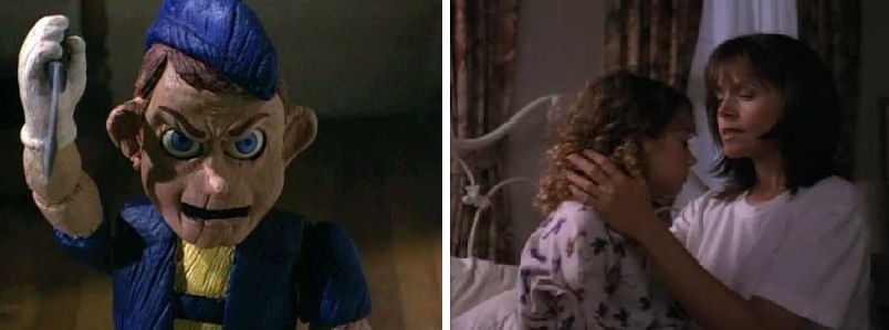 L’histoire en soi est donc suffisamment bien ficelée (n’y voyez aucun jeu de mots) pour maintenir un certain suspense et conduire le spectateur à se poser la question de qui est le coupable dans ce film. Dommage que le reste ne suive pas, et que les éléments concrets à se mettre sous la dent sont minces. Ce qui se dégage donc avant tout dans le film, c’est une interprétation épouvantable, et un sens du drame exagéré. Un câble respiratoire débranché et une attaque au tisonnier seront finalement les seuls méfaits du pantin diabolique. Survient le final où la confrontation entre la mère avocate, la fille effrontée et la marionnette indépendante ressemble effectivement trop à celui de Jeu d’enfant (aka Child’s play, premier opus de la saga Chucky) pour se démarquer (à noter que certaines séquences ont été tournées avec Verne Troyer [Mini-moi dans les Austin Powers] dans sous le costume de Pinocchio). De cette petite revanche, on retiendra des coups de couteau à travers une porte en carton, une blessure à la main aussi redoutable qu’un ongle cassé, et un méli-mélo scénaristique visant à faire du film une descente aux enfers psychologique qui ne fera pas trembler grand monde. L’intention du réalisateur était d’appeler son film Le Syndrome de Pinocchio et non La revanche de Pinocchio, pour souligner cette allégorie psychologique laissant place à l’interprétation des méfaits commis dans l’imaginaire (ou non) de la petite fille.