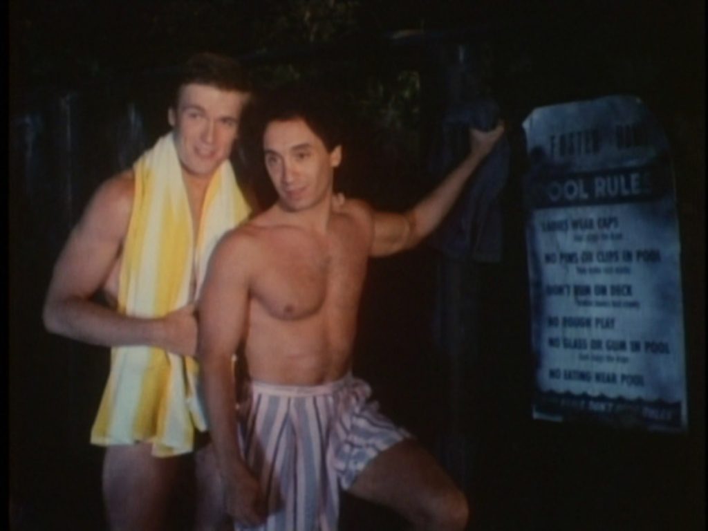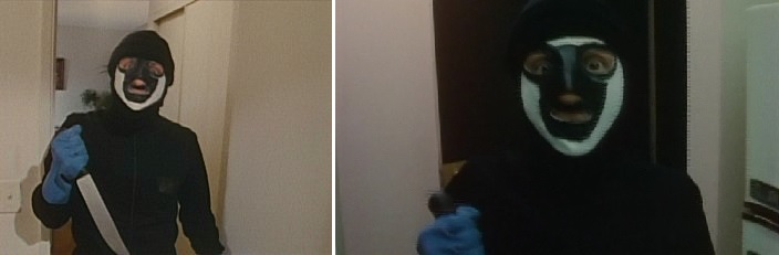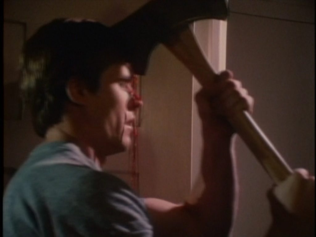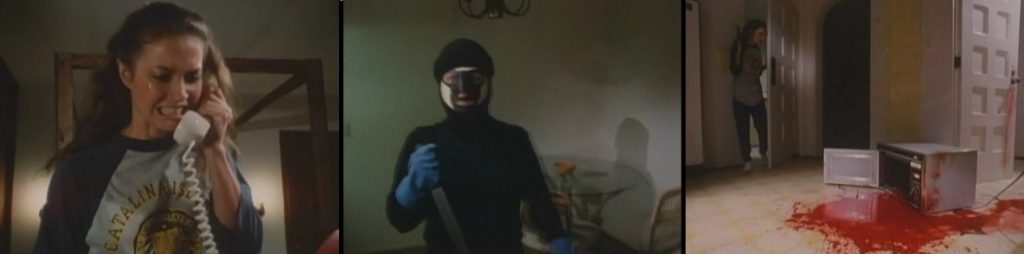 Maison soi-disant hantée, shérif bouffi et incapable, histoires macabres racontées au coin du feu, rythme mou et rebondissements calculés, Evil Laugh cumule les grosses ficelles habituelles comme une éternelle rengaine. Aussi peut-on rapidement se concentrer sur les quelques détails qui le démarquent de ses congénères. Le rire du tueur, déjà, qui permet au croquemitaine de se dissocier par autre chose que sa combinaison ou son mobile de meurtre, comme c’est le cas dans les autres slashers. Surtout qu’au registre de la panoplie et du but macabre du tueur dans Evil Laugh, on frôle la bêtise absolue. Le rire est donc la petite marque de fabrique propre à notre tueur fou (à condition de ne pas voir le film en VF, puisque le doublage de ce rire est, comme toutes les autres voix du film, pathétique à souhait). Les meurtres, dès lors, sont l’autre occasion de trancher avec la monotonie. Couteau, perceuse, hache, machette, coup de masse, strangulation, égorgement… et carnage au micro-ondes, pour la scène la plus mémorable du film (trouver un micro-ondes qui fonctionne aussi efficacement avec la portière ouverte, ça n’est pas donné à tout le monde !). Du bel ouvrage. Ensuite, relevons les très nombreux plans et gags sur la nudité masculine, rare dans le registre, bien qu’aucune référence gay ne vienne les justifier. N’oublions pas la final girl qui se met à tirer à tout va avec son immense revolver sorti de nulle part, pour se défendre contre ce qu’elle croit être le fantôme du massacre de la légende urbaine qu’elle a elle-même raconté à ses amis un peu plus tôt. Enfin, notons le personnage hystérique, flippé de la malédiction qui semble toucher cette maison, qui énonce certaines formules propres aux slashers, notamment le fait que le sexe est synonyme de mort, à la manière de ce qui deviendra dans Scream les règles du genre.