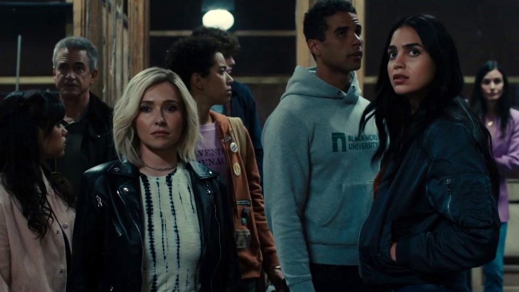 Bien entendu, il serait facile de blâmer le scénario sur la facilité qu’il aura de rameuter tous les survivants du précédent opus dans la Grande Pomme, permettant ainsi à un(des) nouveau(x) tueur(s) de perpétrer une énième vengeance. C’est même un plaisir de retrouver les survivants, débarrassés des personnages idiots (nombreux) de Scream 2022, et rejoints par de nouveaux protagonistes. L’absence de Sidney Prescott à cette nouvelle épopée sanglante n’empêche pas le retour de la journaliste Gale Weather (pétillante Courteney Cox, bien plus éveillée et proche de son personnage comparé à sa performance très effacée dans l’opus 5) et de Kirby Deen (Hayden Penettiere, revenue à sa propre initiative), survivante de l’opus 4 et ici prête à prendre sa revanche sur le tueur masqué. Gale Weathers a même droit pour la première fois dans la saga à son appel de Ghostface, pour une séquence sous haute tension comme on les aime tant. En tout et pour tout, Scream est définitivement devenue une saga dont les intrigues se suivent et s’entremêlent, jouant sur la nostalgie des prémices d’origine tout en s’assurant un patrimoine suffisamment riche pour ne jamais faire tarir la flamme. À l’heure où les franchises aiment prendre à contre-courant leur propres opus en les effaçant de l’intrigue principale (Halloween en tête de lice), la continuité des Scream est aussi salutaire qu’appréciable. À noter que Courteney Cox a été la première à signer pour ce sixième opus, précisant qu’elle adore toujours autant son personnage de journaliste intrépide, et qu’elle serait même prête à rempiler gratuitement pour ce rôle. Un (presque) pied de nez à Neve Campbell qui a estimé ne pas avoir la rémunération méritée pour la reprise de son personnage, et qui a jeté l’éponge, malgré la stupeur des fans et du soutien de bon nombre d’autres acteurs de la saga, tels que Matthew Lillard, interprète de Stu Macher dans le premier Scream, mais aussi Jamie Kennedy, Sarah Michelle Gellar et Emma Roberts (respectivement Randy dans Scream, Cici dans Scream 2 et Jill dans Scream 4).