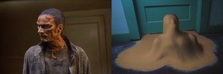 Visuellement, le tueur est plus impressionnant dans la campagne marketing faite autour du film que dans le métrage lui-même. Ni très effrayant, ni très surprenant, ni très drôle, l’homme de sable traverse les trous de serrure comme il traverse le film : sans charisme ni énergie. Ses pouvoirs ne sont pas très subtils puisqu’il étrangle comme un humain, noie en son sable mouvant, défonce des crânes ou dépèce des corps. Ah si : il fait de son bras un pic ou surgit du sol à la manière du T-1000 de Terminator 2 de James Cameron (1991), film auquel on ne peut s’empêcher de penser à chaque mouvement semi-liquide du croquemitaine de sable. Le scénario (signé par le réalisateur du film, Turi Meyer, futur metteur en scène du nullissime Candyman 3 : le jour des morts et tourné depuis dans les séries TV) creusera un peu plus profond dans le cliché en essayant de raconter une histoire à ce croquemitaine improbable. Dès lors il devient lui-même la victime d‘un père bourreau qui lui cousait la bouche et le frappait sans raison. De plus, uni par le sang au jeune homme qu’il doit tuer, ce lien devient un mobile restant surtout un prétexte assez dur à encaisser. Et au-delà de ça, le film ne conserve même pas le suspense sur ce qui peut éradiquer le monstre (l‘eau et la chaleur), puisqu’ils sont cités ou exposés à tout bout de champ durant le métrage…