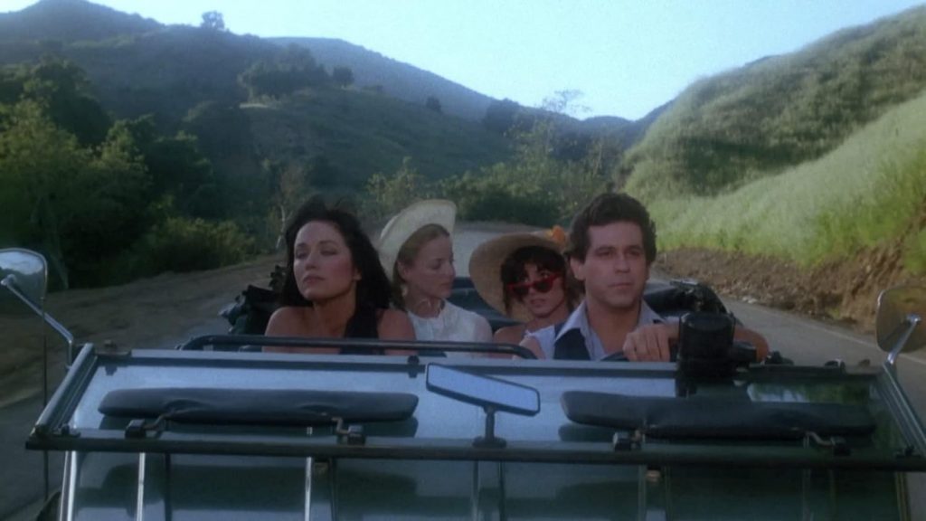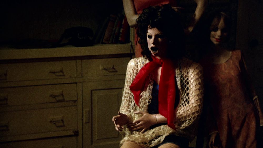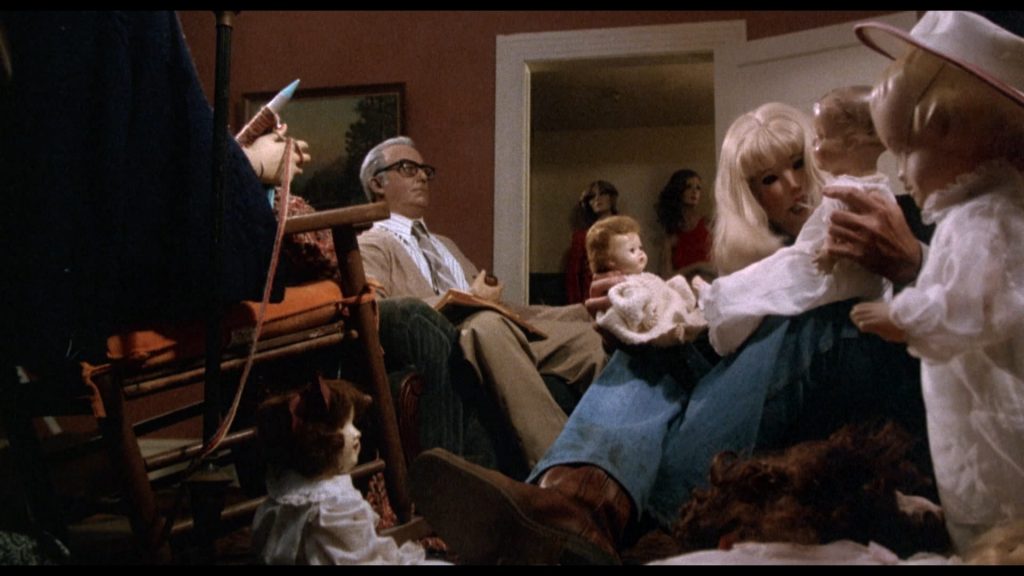 C’est dès la scène d’ouverture que l’ambiance s’installe, avec la rencontre incongrue dans une station service abandonnée d’un promeneur égaré et des mannequins lugubres soudain animés comme par magie maléfique. Sous les rires sataniques, le visuel angoissant des mannequins, la musique viscérale de Pino Donaggio (compositeur des partitions de Carrie, Piranhas, Body Double, Hurlements, Pulsions, Trauma et Le fils de Chucky) et la situation tout à fait absurde et effrayante des objets prenant vie, l’ambiance est déjà très glauque, bien qu’en plein jour. Dès lors, lorsque le reste du groupe se retrouve à son tour perdu aux abords de ce chemin ne menant qu’à la ferme du vieux monsieur Slauson revue en musée de fortune, l’issue en sera forcément malheureuse. Il faudra cependant pour cela s’atteler d’une grande patience, doublée d’une indulgence à l’égard des personnages assez sommaires (si ce n’est carrément ennuyeux) n’ayant pas bénéficié d’une personnalité attrayante ni de séquences de dialogues bien passionnantes. Le contraste « jeune génération de la ville » contre « le vieux vétéran rural » ne sera que l’énième exemple du genre, comme on en verra dans toute confrontation entre les protagonistes sensés représenter le public contemporain, et les bouseux un peu débiles du terroir local façon Vendredi 13, Massacre à la tronçonneuse et consorts…