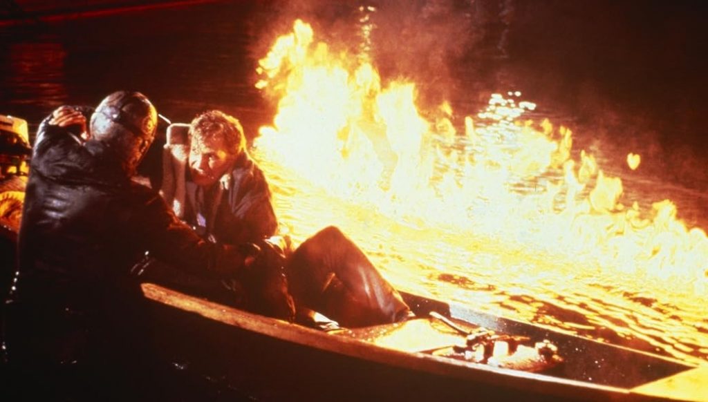 Scénaristiquement parlant, on a atteint à ce moment les limites de ce qu’un Vendredi 13 pouvait apporter de nouveau, à la différence que ces quelques ingrédients sont cette fois, par le biais de son réalisateur et scénariste Tom McLoughlin (Nuit noire, Vengeance diabolique) sont savamment orchestrés par un recours à l’humour et à un sens du rythme sans temps mort. Tant mieux, puisque ces quelques éléments de l’histoire abordés, le reste s’appuie sur une nouvelle tapée de jeunes monos écervelés aux hormones bouillonnantes, et quelques personnages secondaires à l’issue toute tracée ne servant que de chair à pâtée pour le tueur (une équipe de blaireaux en pleine partie de paint-ball, des flics toujours aussi dignes de la profession telle que dépeinte dans les films d’horreur, et des vacanciers égarés en mal de sensations fortes qui ne vont, sur ce point, pas être déçus du voyage). Les vraies surprises ne reposeront donc pas sur les personnages mais sur les situations, mêlant pastiche et vraies scènes de frousse, le tout aidé par des effets visuels bluffants et d’une grande fraîcheur, signés par l’équipe de Brian Wade (Les dents de la mer 3, Freddy 4, Terminator, Gremlins 2) et du propre frère du réalisateur : James McLoughlin (Le sous-sol de la peur, Le Cercle, Land of the dead, Wolf Man 2025). On notera pêle-mêle le double assassinat dans un van lancé à vive allure, les apparitions terrifiantes de Jason à une innocente petite fille sur le camp, et l’affrontement final tout feu tout flamme entre Tommy et Jason sur le lac, parmi d’autres excellentes scènes du film.