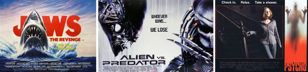 Parmi les meilleurs, pas d’Halloween à l’horizon, bien qu’un internaute propose l’inévitable The Night HE came home (La Nuit où IL est revenu) du film de John Carpenter de 1978. Dans la liste des 40 meilleurs, on retrouve toutefois l’imparable In space no one can hear you scream (Dans l’espace, personne ne vous entend crier) d’Alien (1979), mais aussi Check in. Relax. Take a shower (Entrez. Détendez-vous. Prenez une douche) du remake de Psycho (1998), You don’t get to 500 million friends without making a few enemies (On ne peut pas avoir 500 millions d’amis sans se faire quelques ennemis) pour The Social Network (2010), Whoever wins, we lose (Quel que soit le gagnant, nous perdons) pour Alien vs Predator (2004) ou encore Just when you thought it was safe to go back in the water (Juste quand vous pensiez qu’il était sûr de retourner se baigner) des Dents de la Mer, 2e partie (1978).