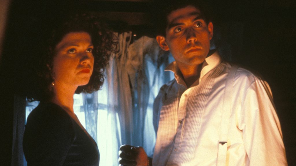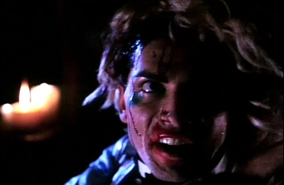 Les personnages étant très limités (dans leur nombre et dans leurs facultés mentales), on n’évite malheureusement pas quelques longueurs dans l’intrigue, avec le quatuor errant dans la maison à la recherche du scénario. L’entourage de l’héroïne ayant la profondeur d’une capsule de bouteille, leurs déboires sont aussi insipides que leurs dialogues. Une latence qui endort plus qu’elle ne maintient un certain suspense, mais qui permet en tous les cas de dérouler le tapis rouge au père Jonas lorsque celui-ci tombe la lame de son poignard sur ses victimes. Si on regrette que les armes ne soient pas plus variées (coups de poignard, strangulation, égorgement, boîte crânienne écrasée), reconnaissons un certain goût pour la mise en scène pour des choix d’issues fatales empruntes à un grand sens du spectacle (la crucifixion, la punition par les flammes). En guise de remplissage, on a donc droit aux recours habituels des productions des années 90 (qu’on verra resservies à outrance jusqu’à la fin des années 2000) : quelques caresses coquines entre filles, des parties de jambes en l’air avec l’accent sur des fessiers féminins ou masculins, des plans serrés sur les cabotinages du curé de l’enfer, et un éclairage tamisé pour tenter de donner de la profondeur aux décors à défaut d’en accorder aux personnages.