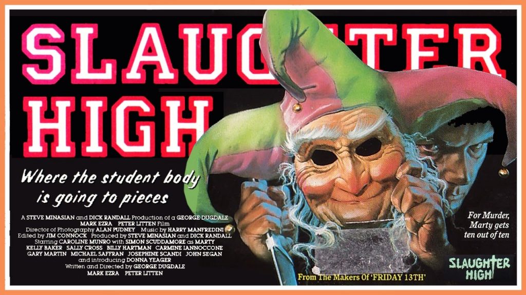 Ce qui ne déroge pas au mythe est la triste et sordide destinée de l’interprète de Marty, Simon Scuddamore, qui, ne se remettant pas d’une sévère dépression, a mis fin à ses jours par abus de drogue peu après le tournage du film, à seulement 28 ans. La production a dès lors du faire intervenir le scénariste Mark Ezra pour jouer le tueur dans quelques scènes additionnelles, et sortir le film deux ans après la fin de son tournage pour atténuer l’ampleur du drame. À noter que le film devait à l’origine s’appeler April fool’s day, avant que la Paramount n’achète ce titre pour son Weekend de terreur sorti également en 1986, obligeant le film à être rebaptisé Slaughter High. À son bord, la plus que trentenaire mais toujours étudiante de charme Caroline Munro (future épouse du réalisateur, et égérie dans L’espion qui m’aimait) et Carmine Iannaccone (devenu depuis professeur d’art) assurent chacun dans leur genre la part sexy du film, aidés au casting de quelques pouliches n’hésitant pas à exhiber leur poitrine généreuse à l’écran, et par l’apparition de Dick Randall (Le sadique à la tronçonneuse, dont on voit d’ailleurs l’affiche en fond) dans le rôle de l’agent un peu sagouin de Carol.