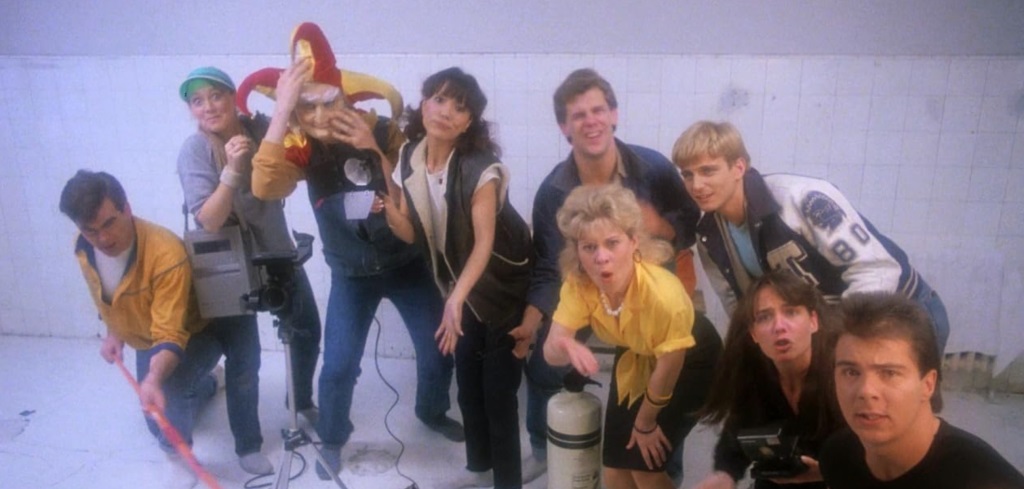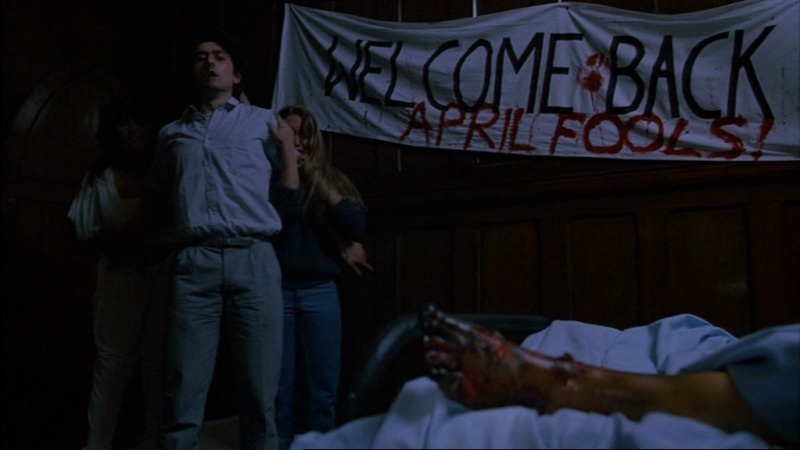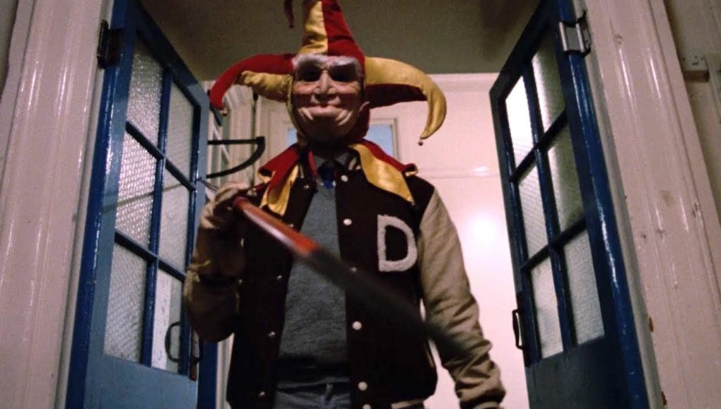 Dans une aile désaffectée du lycée, la bande mystérieusement réunie par Marty va à son tour être l’objet de blagues fatales, d’un empoisonnement à l’acide à une crucifixion en passant par une noyade en fosse sceptique et un florilège de morts violentes (tête empalée dans un crochet, coup de barre de fer, bain à l’acide, écrasement sous un tracteur), sans oublier le coït le plus électrisant de toute l’histoire du cinéma ! Le look du tueur et quelques belles idées de mises en scène (l’ombre du bouffon lors de la pendaison par exemple) accentuent cette ambiance coupée au couteau.